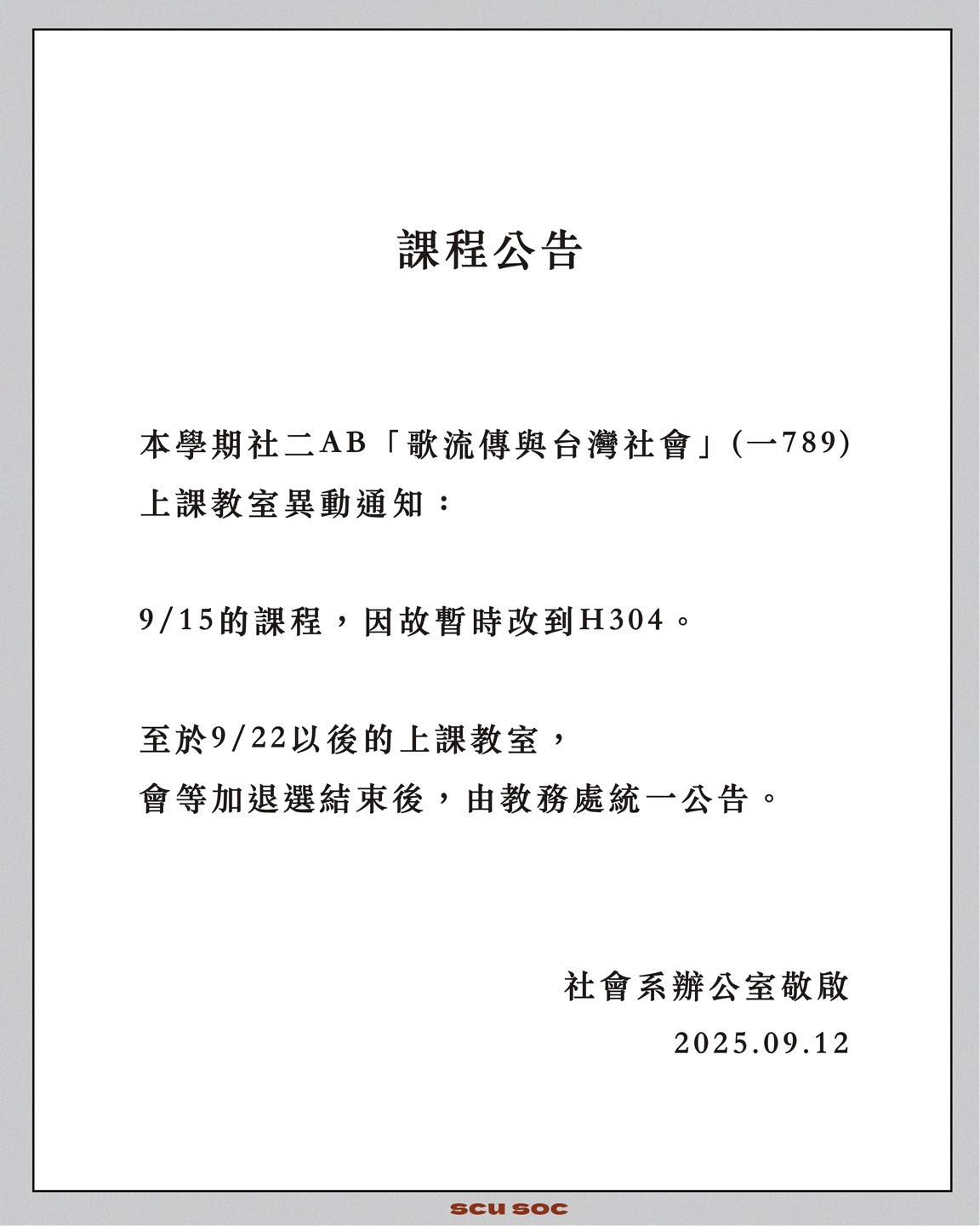 【通知】本學期社二AB「歌流傳與台灣社會」(一789)上課教室異動
