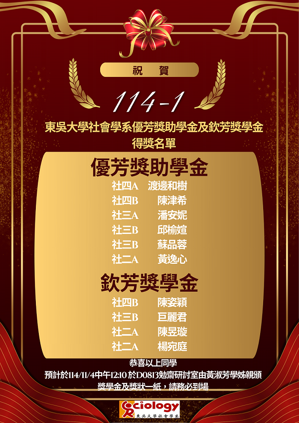 114-1 本系優芳獎助學金、欽芳獎學金 得獎名單