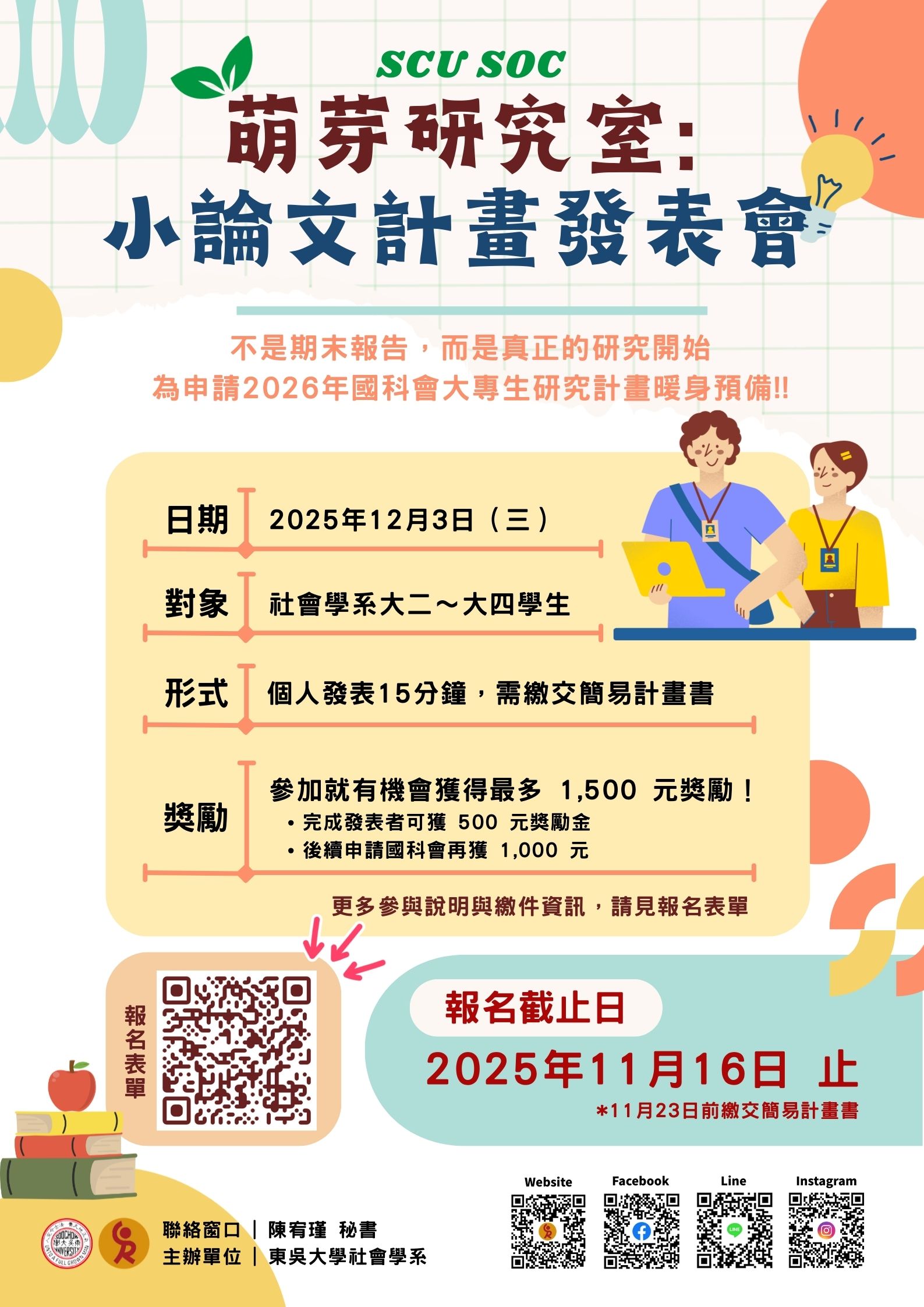 為協助同學準備 2026 年國科會大專生研究計畫申請,本系特別舉辦「萌芽研究室:小論文計畫發表會」,透過公開發表與教師回饋,強化學生的研究構想與計畫書撰寫能力,歡迎社會學系大二至大四同學踴躍參與!