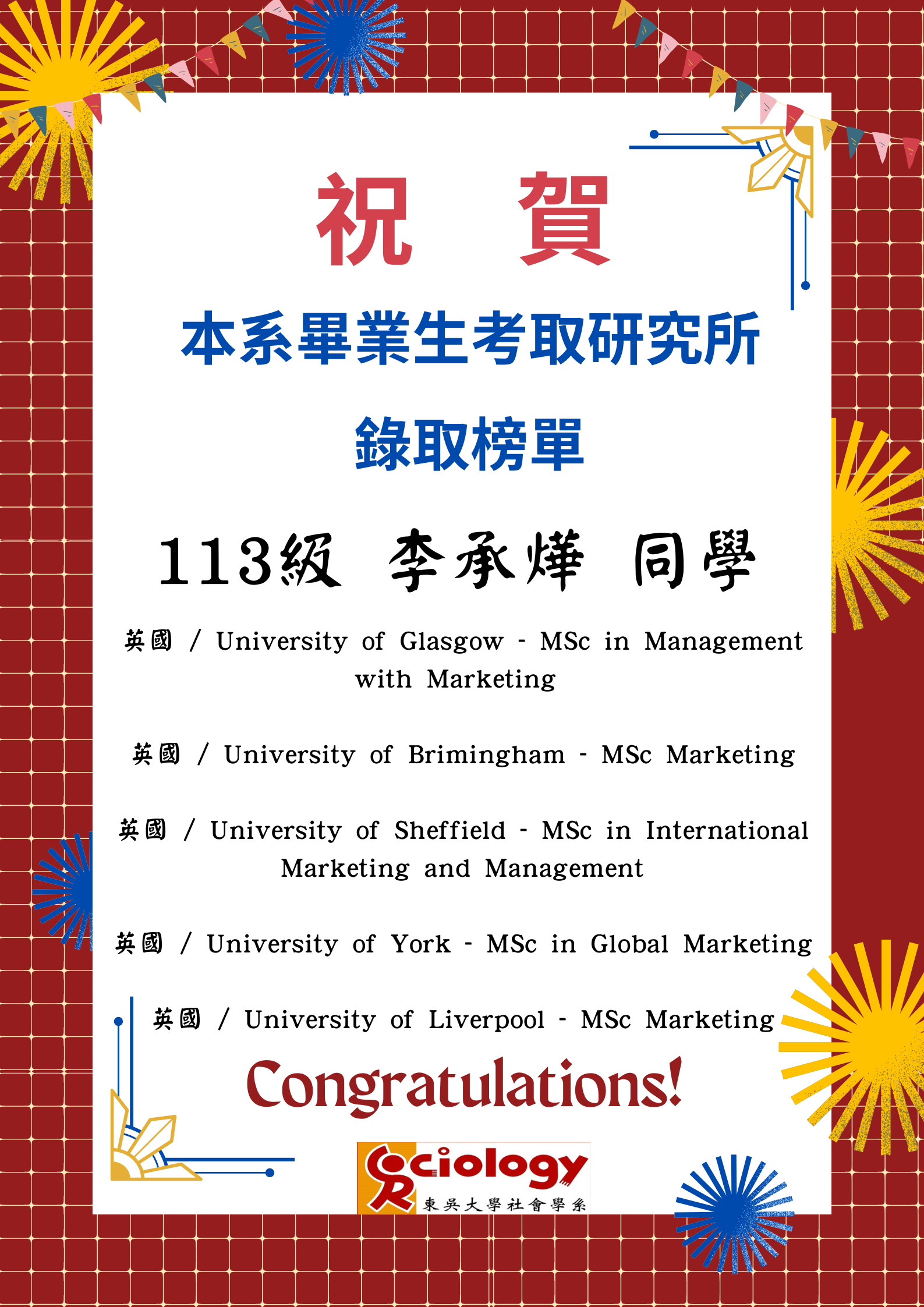 [賀榜]恭賀本系李承燁畢業生研究所金榜題名