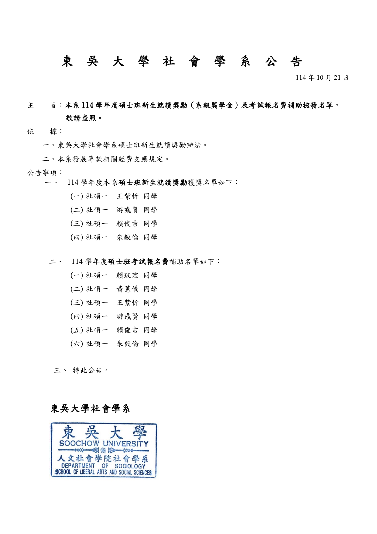 公告本系114學年度碩士班新生就讀獎勵(系級獎學金)及考試報名費補助核發名單,敬請查照。