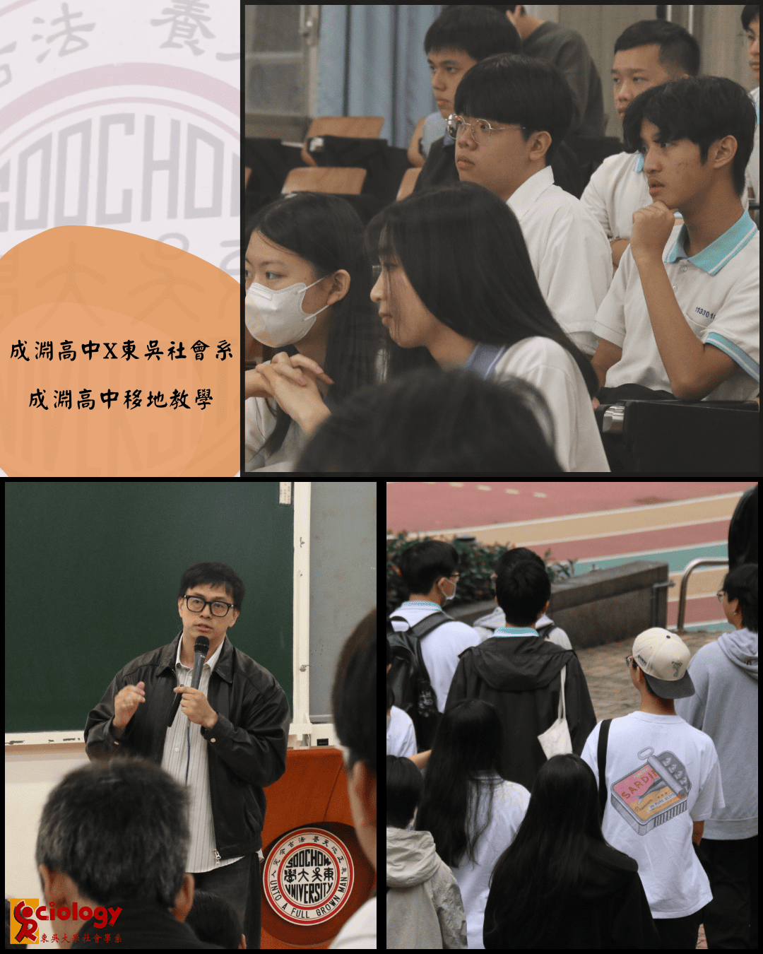本系教師與系友支援成淵高中教授多元選修課程已有三年,每學期本系皆有安排成淵高中同學前來東吳進行移地教學。這學期的移地教學時間是安排在11月14日(週五)上午,約有60位成淵高中ㄧ、二年級到東吳學習。這次移地教學特別邀請到范綱華老師、劉育成老師、陳伯彥學長講授本系三大職涯-社會調查、社會創新、社會政策的相關內容。之後,再由本系志願同學帶領成淵高中同學至校史館參觀,以及安排校園路線的巡禮。最後在11:00的時候,所有成淵高中同學參與得興主任的課堂講座,與本系大學生一起聆聽華新麗華公司羅慧萍副總經理講授有關ESG永續社會學的專題演講。成淵高中同學們表現了相當積極的學習熱忱,並與講者有許多對話與互動。最後,本系感謝碩專班陳炳宏系友,對於本次活動的協助。