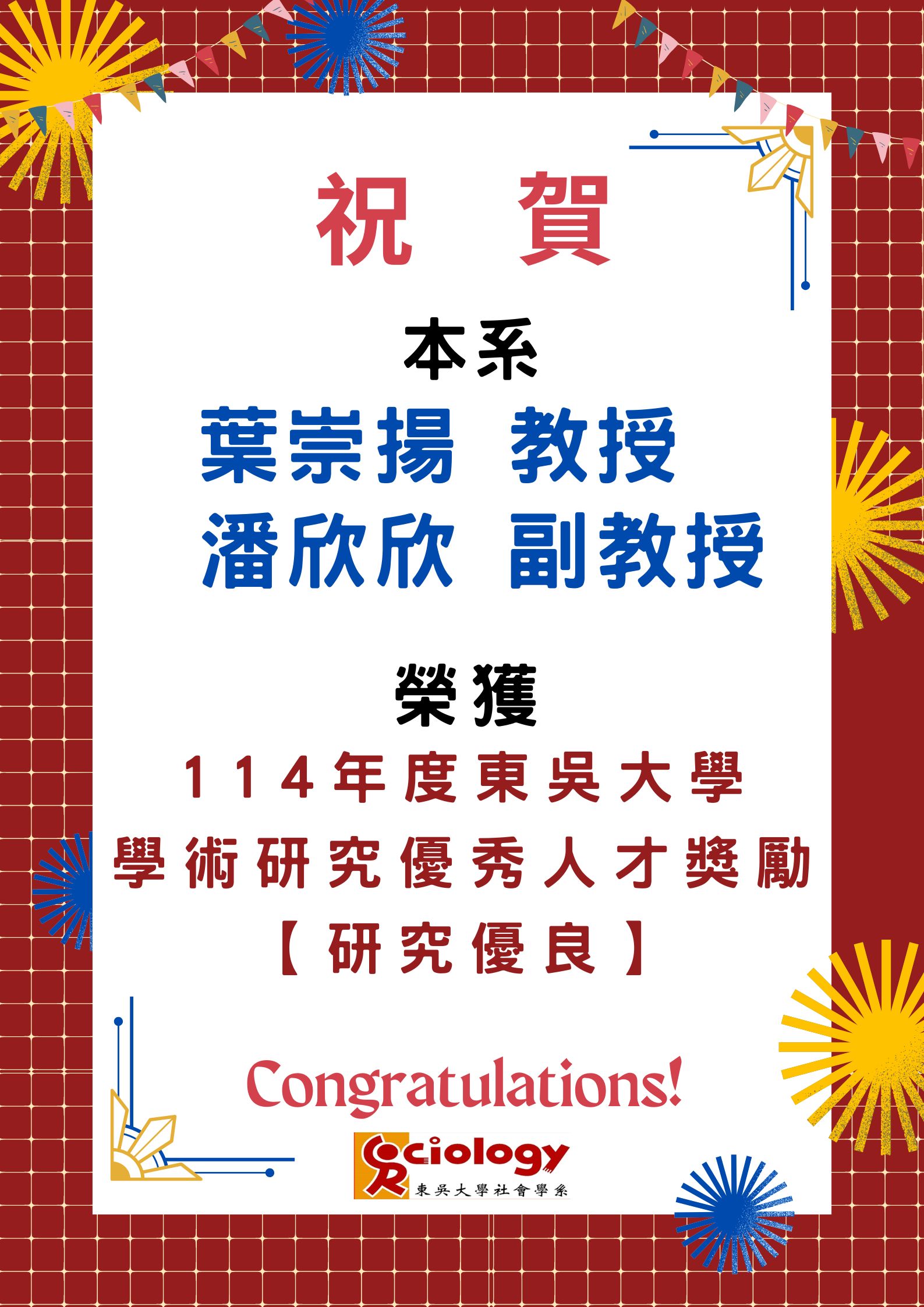 [賀榜]恭喜本系葉崇揚教授、潘欣欣副教授獲「114年度東吳大學學術研究優秀人才獎勵—研究優良」