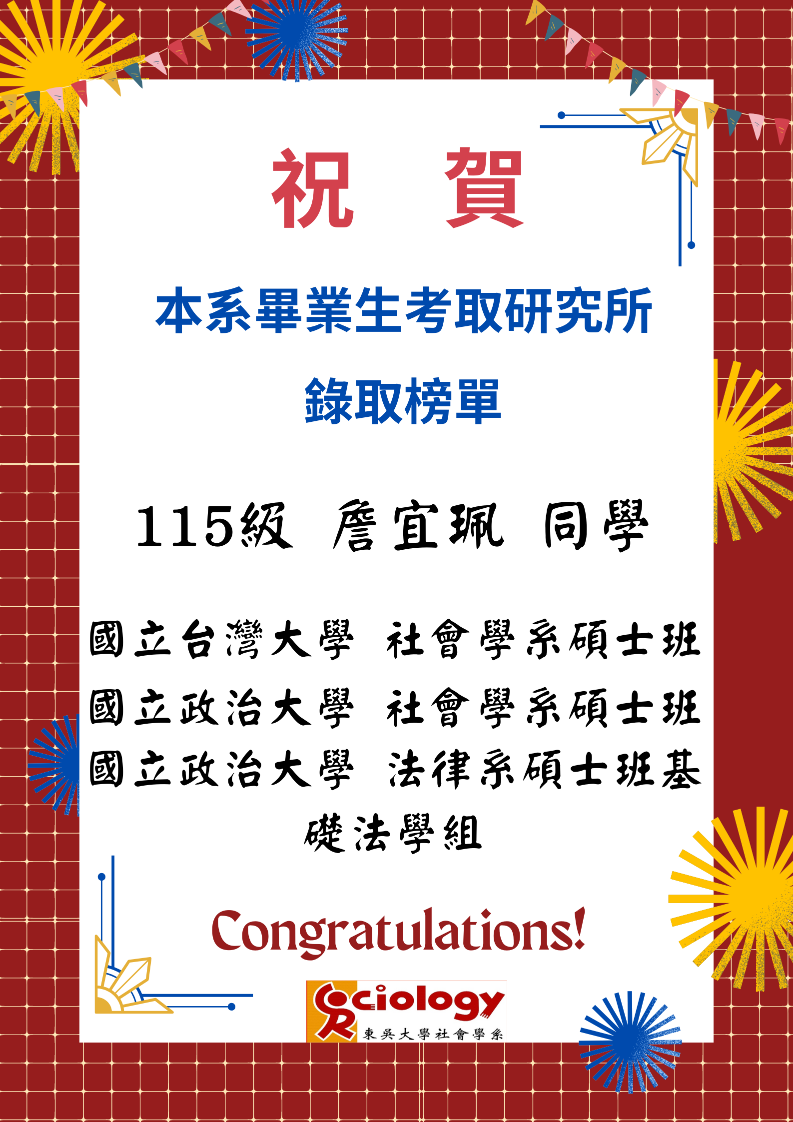 [賀榜]恭賀本系學生詹宜珮研究所金榜題名