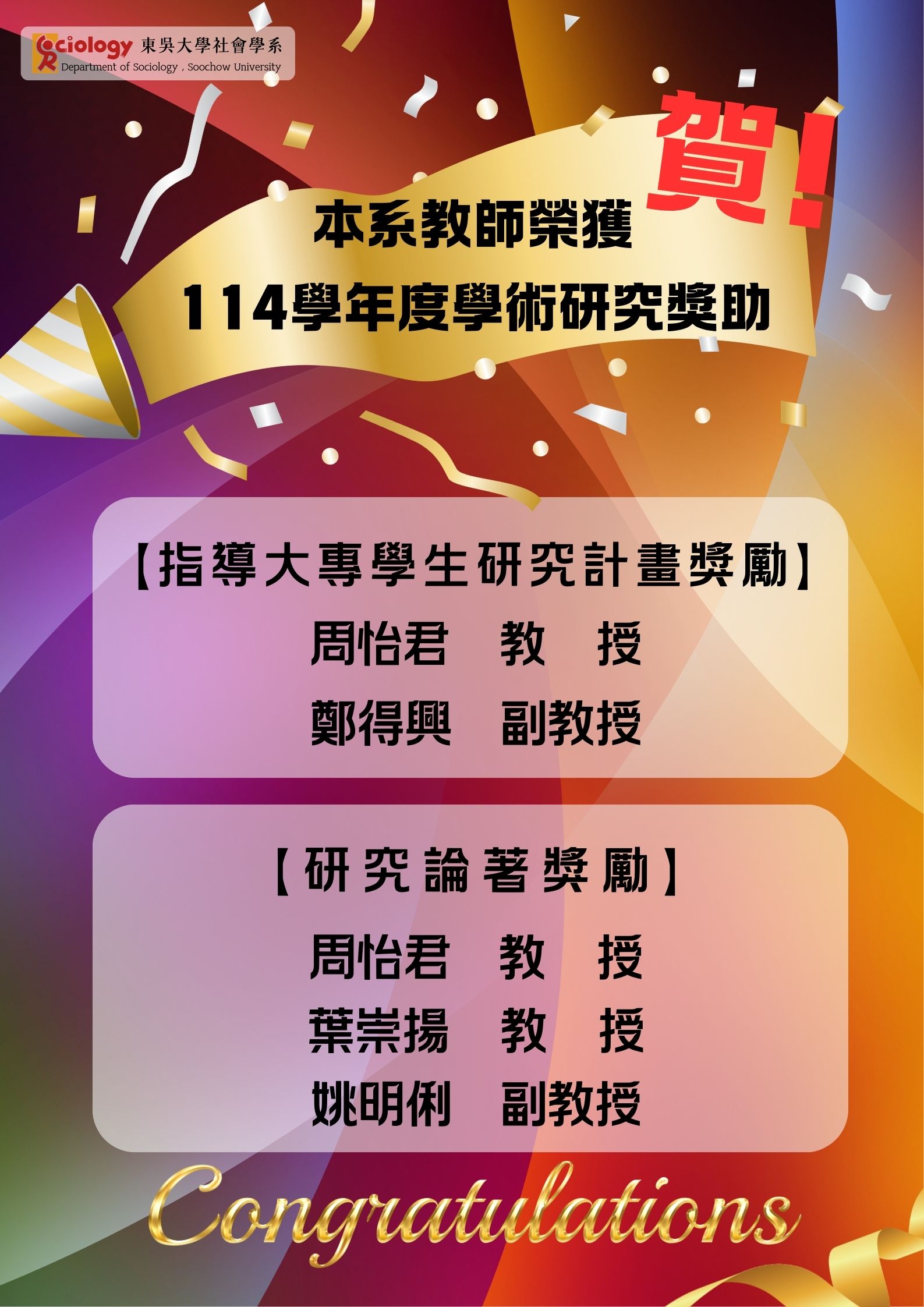 賀! 本系教師榮獲本校 114 學年度教師學術研究獎助,名單如下: 指導大專學生研究計畫獎勵 周怡君 教授 鄭得興 副教授 研究論著獎勵 周怡君 教授 葉崇揚 教授 姚明俐 副教授 恭賀各位老師在研究與學生指導上的努力與貢獻!
