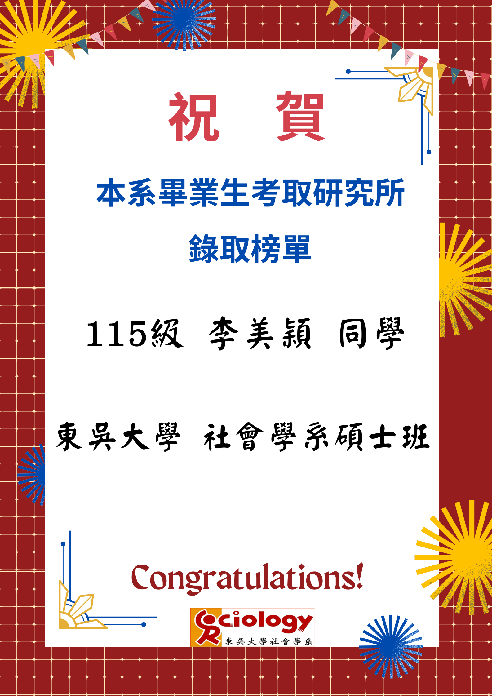 [賀榜]恭賀本系學生李美穎研究所金榜題名
