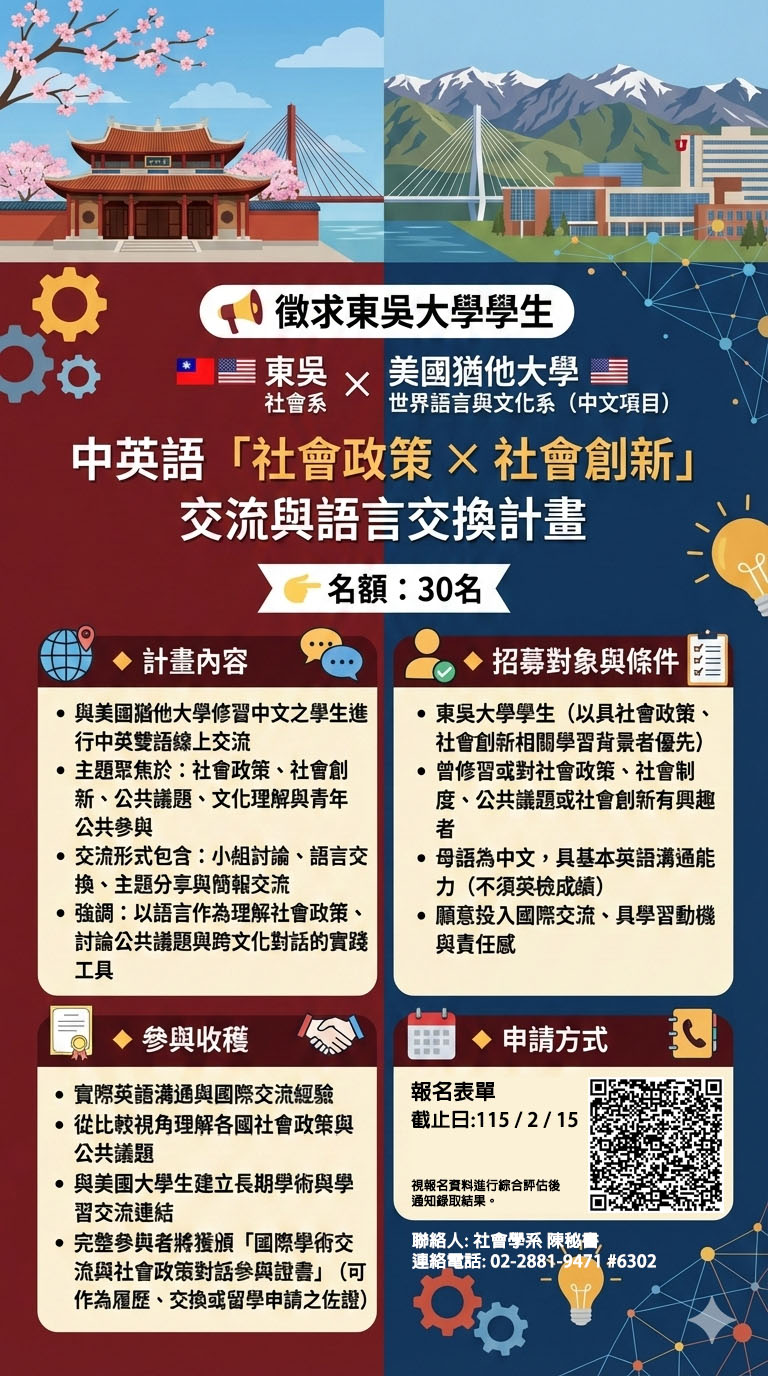 為拓展學生國際視野、強化跨文化溝通與公共議題素養,東吳大學社會學系近日與美國猶他大學(University of Utah)世界語言與文化系(Department of World Languages & Cultures)中文項目啟動跨系交流與文化合作,推出「中英語『社會政策 × 社會創新』交流與語言交換計畫」。本計畫以中英雙語線上互動為核心,透過跨校、跨領域的共同討論與合作,促進台美學生在社會政策、社會創新及公共議題上的對話與學習。