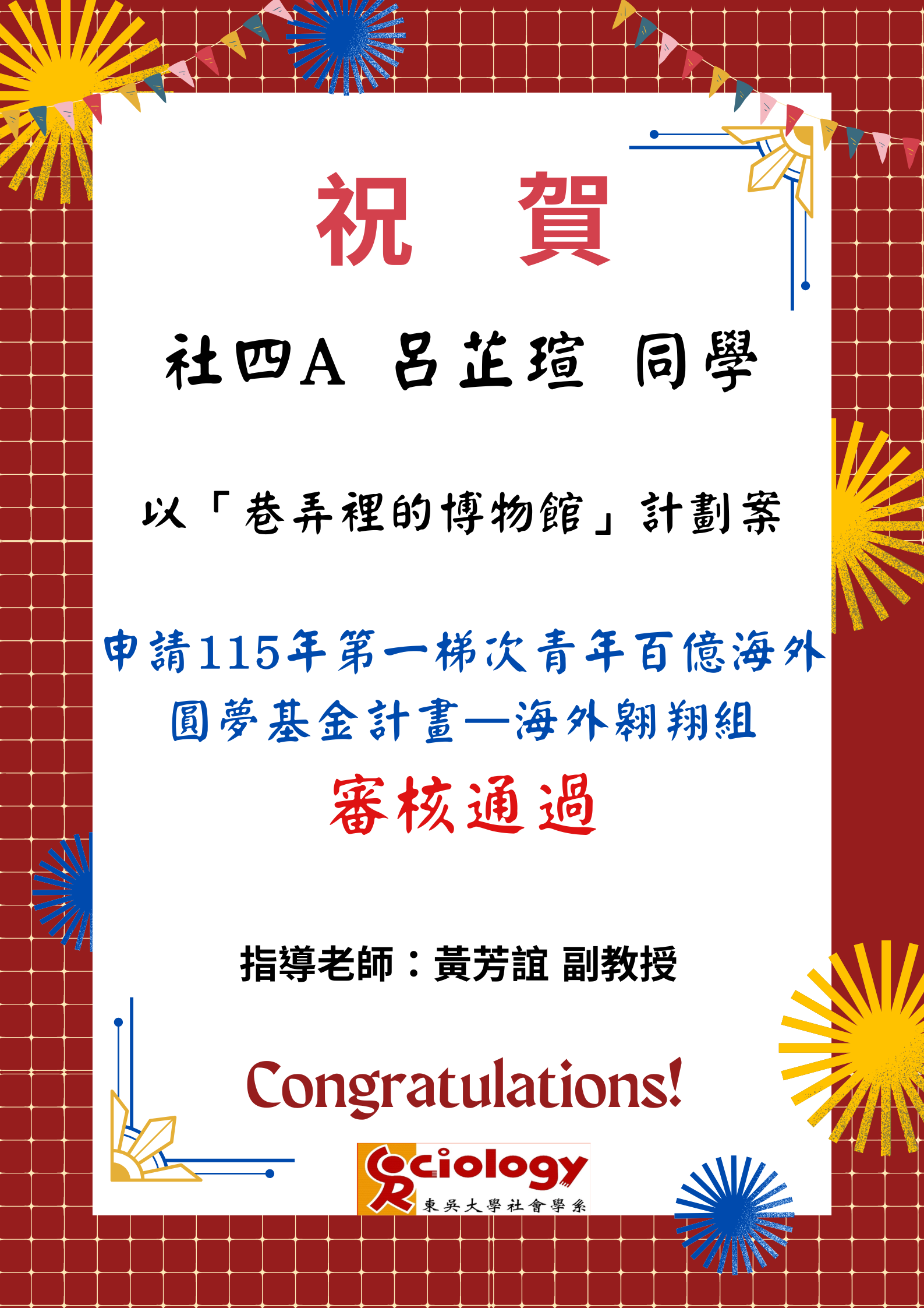 賀!本系學生榮獲「青年百億海外圓夢基金計畫」海外翱翔組入選 本系學生 呂芷瑄同學 在 黃芳誼副教授 指導下,申請教育部「115年第一梯次青年百億海外圓夢基金計畫—海外翱翔組」 面試審查順利通過,正式獲選入選! 呂芷瑄同學以計畫案-「巷弄裡的博物館」 成功獲得評審肯定,將於115年5月25日至6月9日赴海外進行圓夢行動計畫。 此項計畫競爭激烈,入選殊為不易,充分展現本系學生優秀的學術實力、行動力與國際視野,也彰顯本系在公共議題與跨域實踐上的深耕成果。 特此公告,並致上最誠摯祝賀! 東吳大學社會學系 敬賀 中華民國115年2月23日