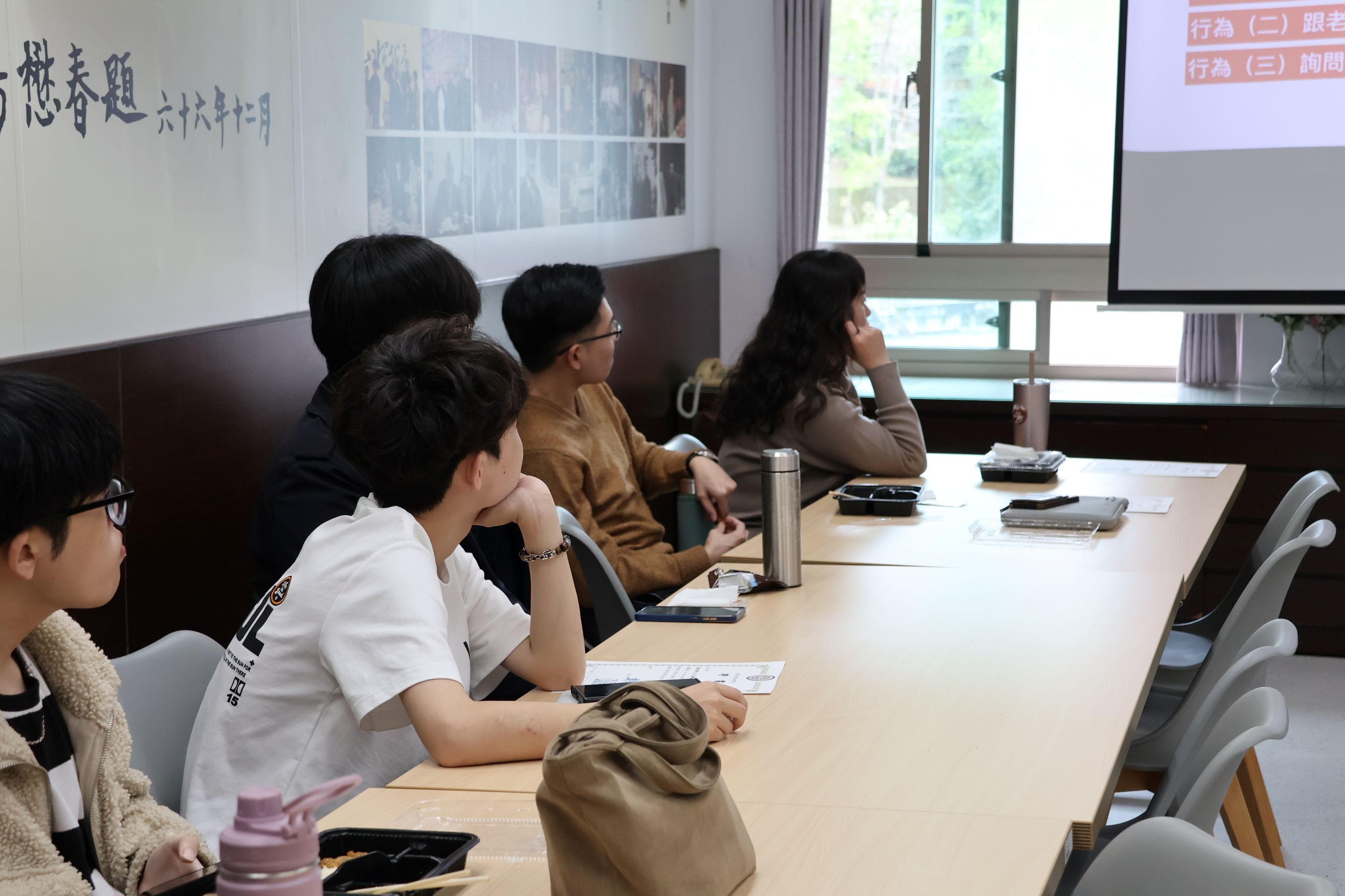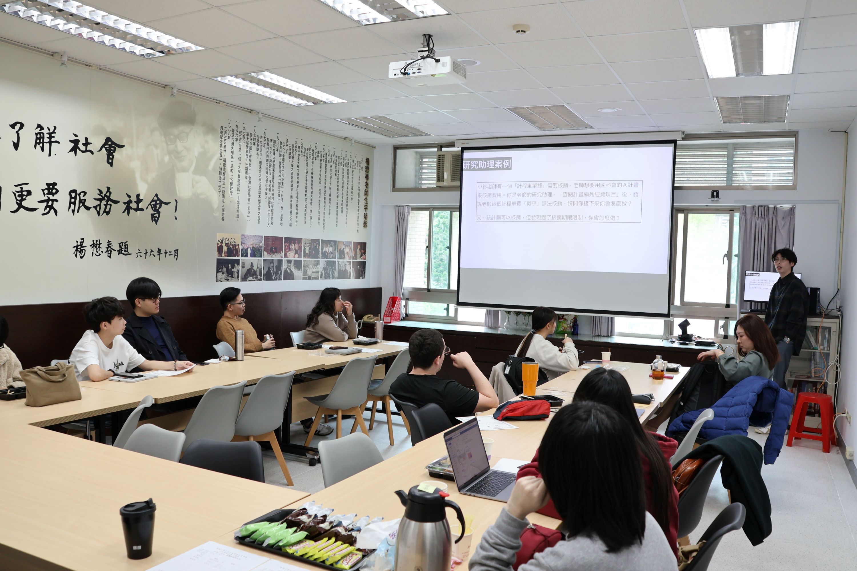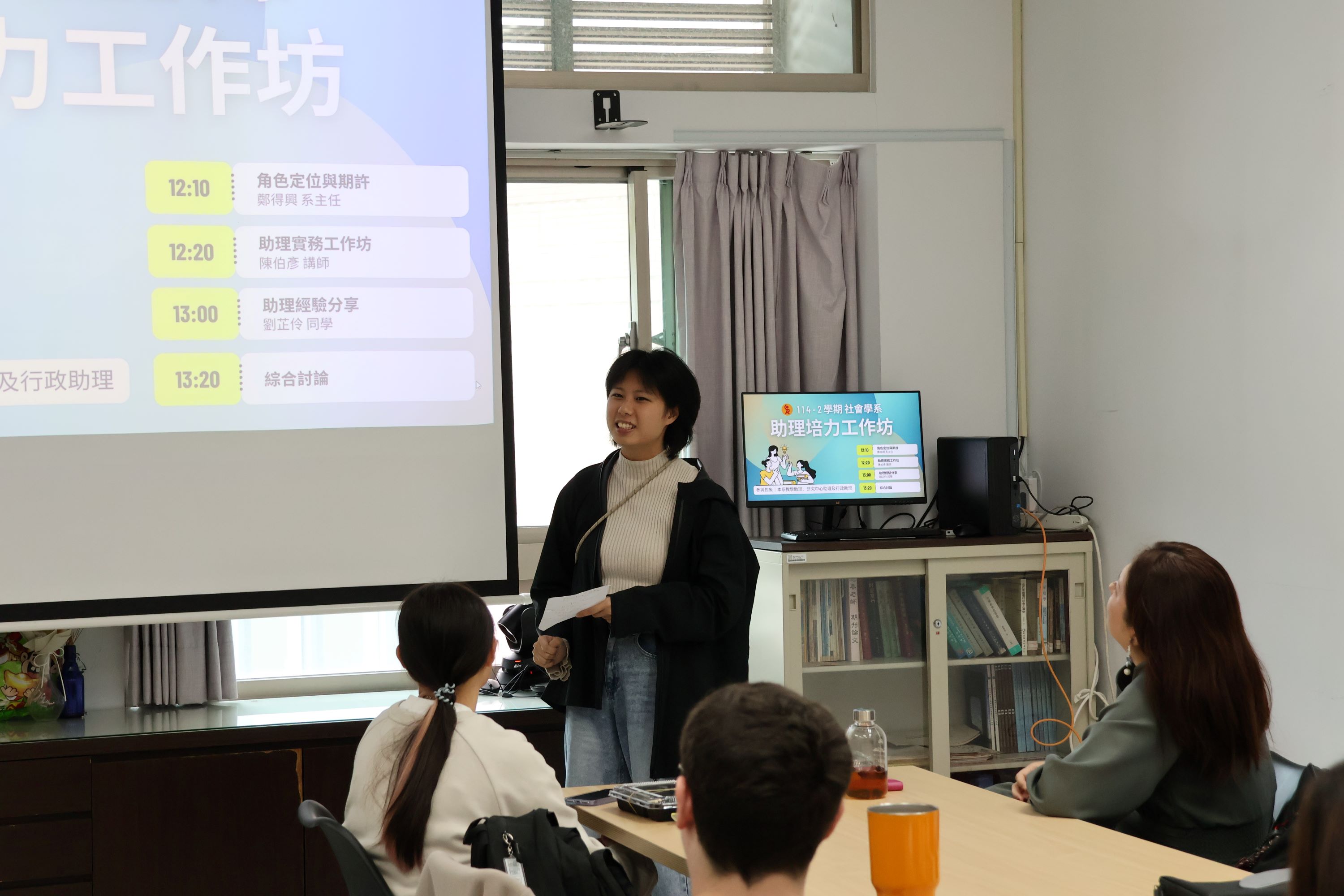 在經驗分享環節,本系碩班學生劉芷伶也分享自己擔任助理的實際經驗與工作中累積的學習與成長,提供實用的建議。透過同儕經驗的交流,讓同學對助理工作的實際情況有更清楚的認識。最後同學們也透過提問與交流,增進對工作內容的理解,也促進彼此之間的交流,並提升整體助理團隊的專業能力與教學品質。