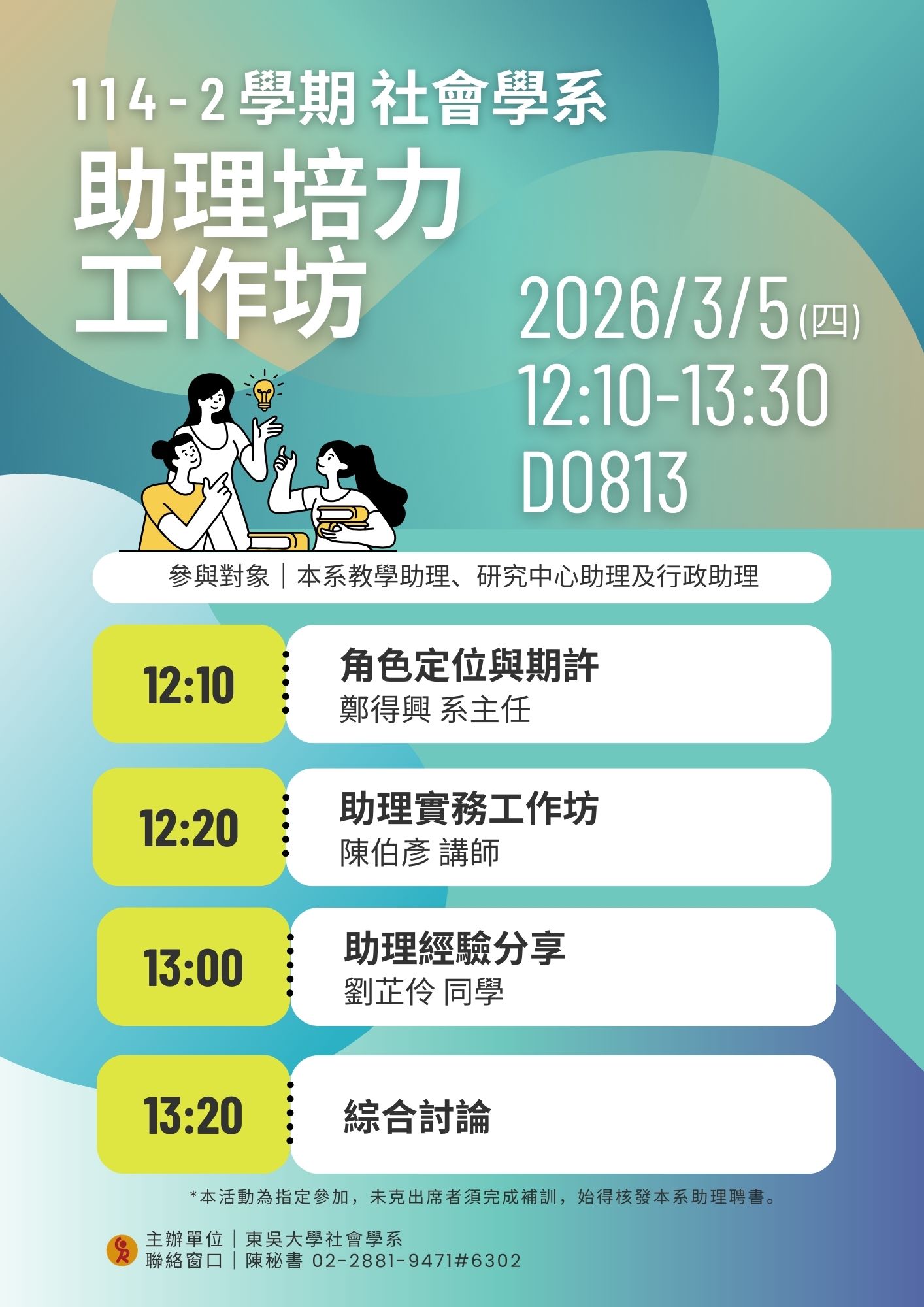 為協助系上各類助理熟悉工作內容並提升能力,本系舉辦助理培力工作坊,邀請本系教學助理(TA)、研究中心助理(RA)與行政助理(AA)共同參與,透過實務分享與經驗交流,協助同學更了解助理工作任務與角色定位。