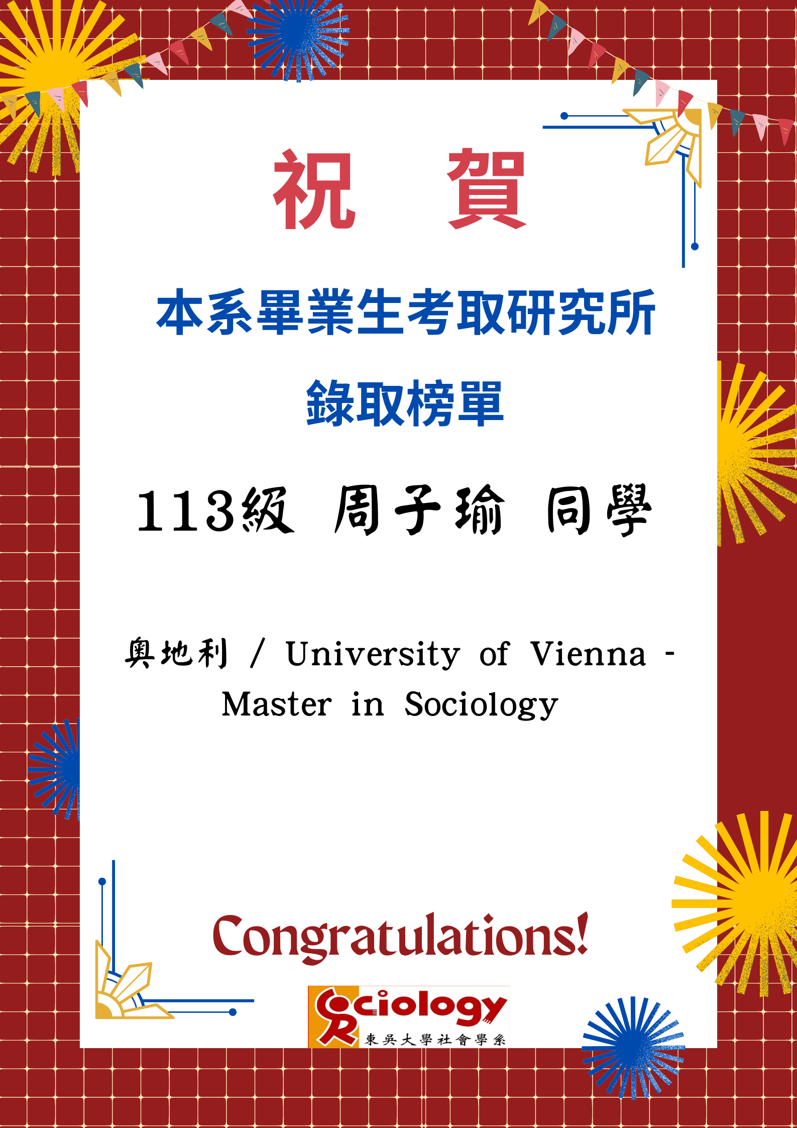 [賀榜]恭賀本系畢業生周子瑜研究所金榜題名