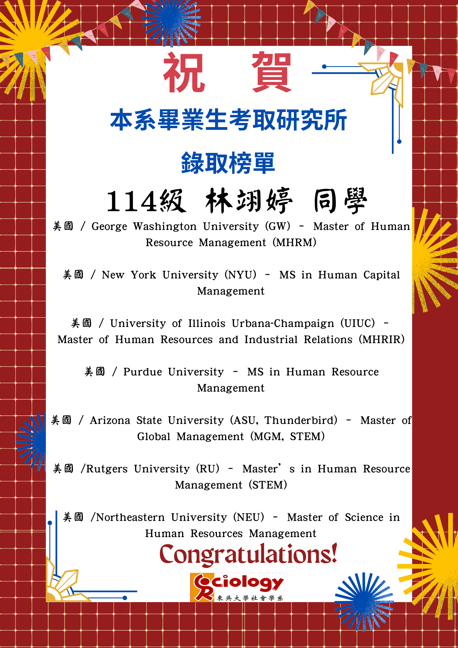 [賀榜]恭賀本系畢業生林翊婷研究所金榜題名