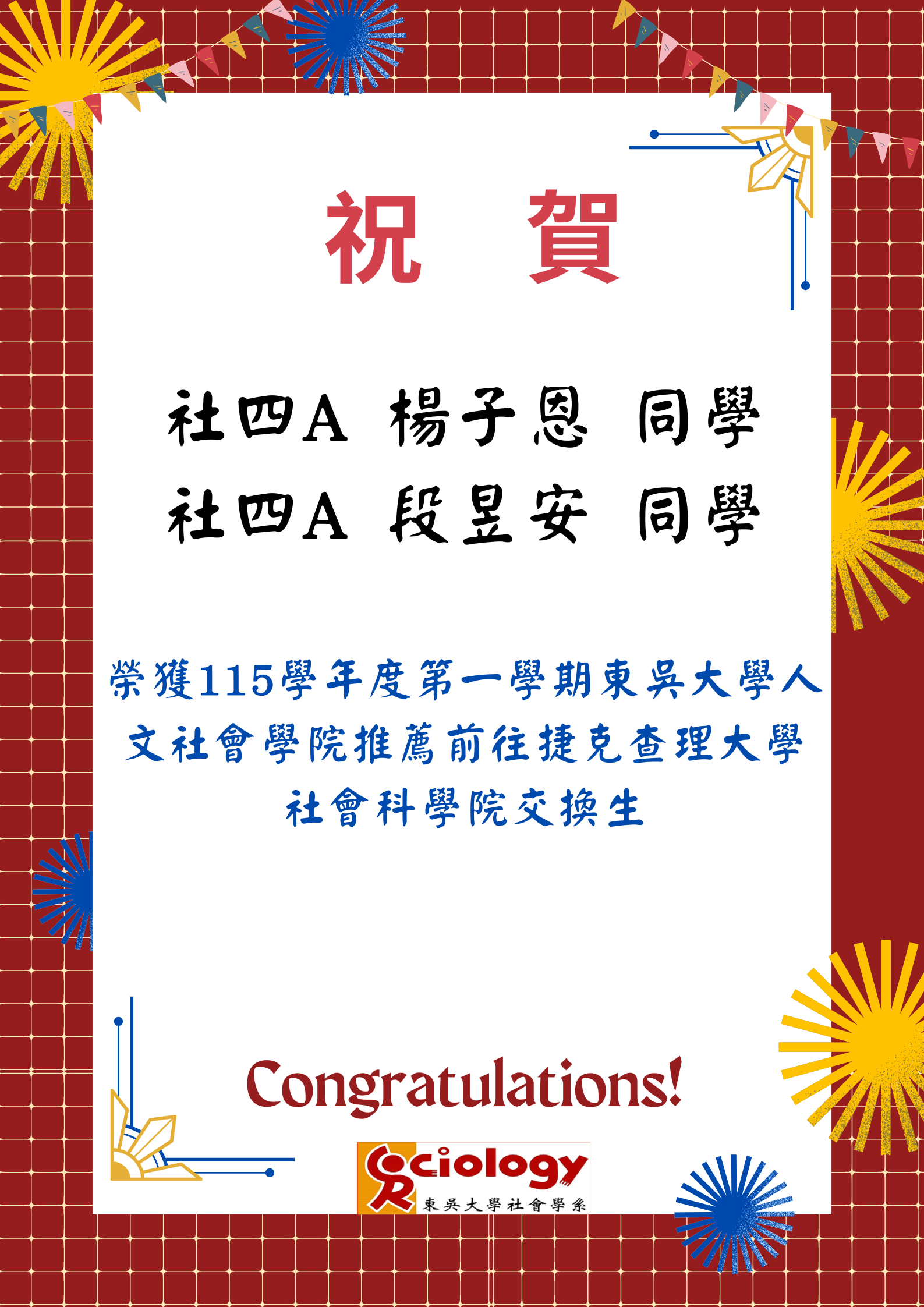 [賀榜]本系學生榮獲115學年度第一學期東吳大學人文社會學院推薦前往捷克查理大學社會科學院交換生