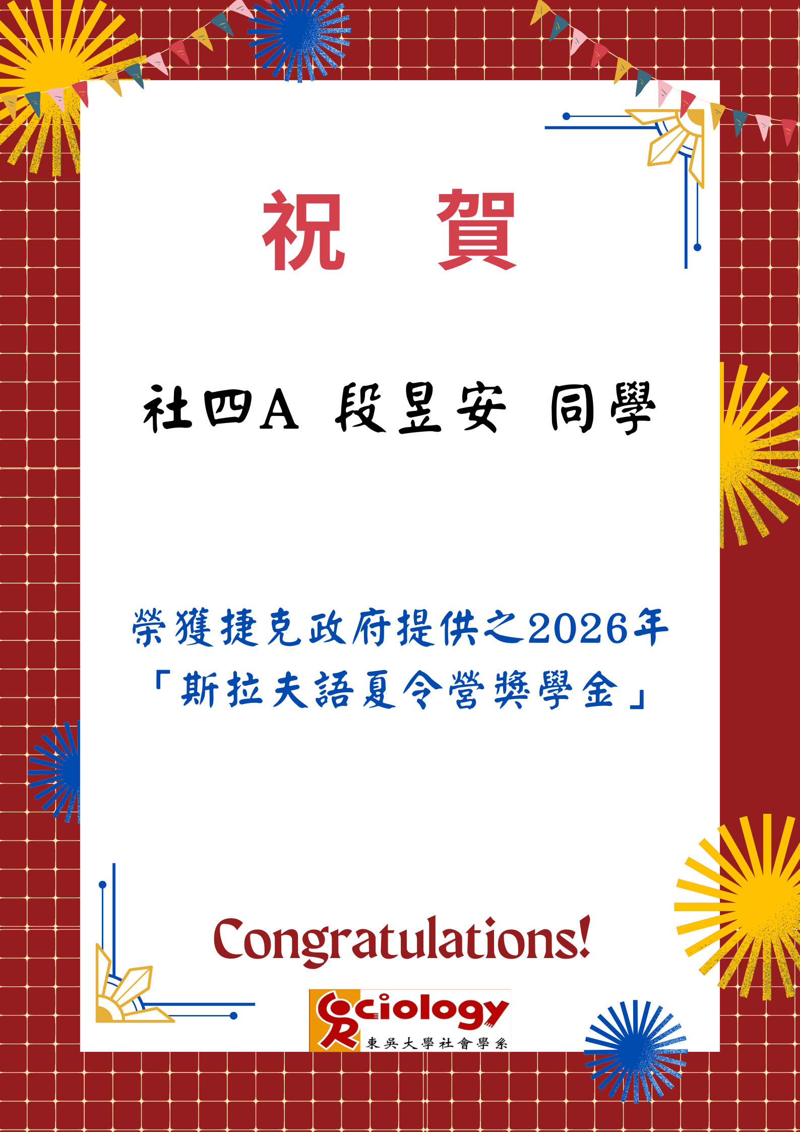 [賀榜]社四A 段昱安 同學 榮獲捷克政府提供之2026年 「斯拉夫語夏令營獎學金」