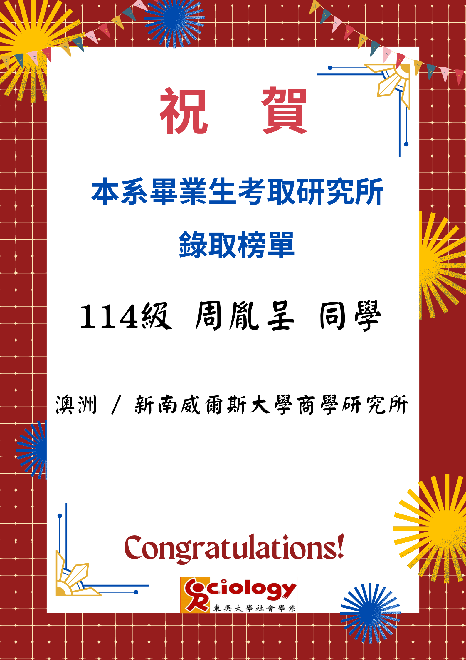 [賀榜]恭賀本系畢業生周胤呈研究所金榜題名